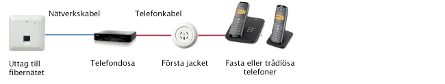 Har du bara en telefonitjänst kopplar du telefondosan till port 3 på fiberboxen med en nätverkskabel (Ethernet). Sedan ansluter du telefondosan till ditt första telejack, så blir alla dina telefonuttag anslutna till bredbandet. Du kan använda din vanliga telefon (fast eller trådlös).Läs instruktionen som medföljde telefondosan för igångsättning av tjänsten så är du snart redo för dina första bredbandssamtal.